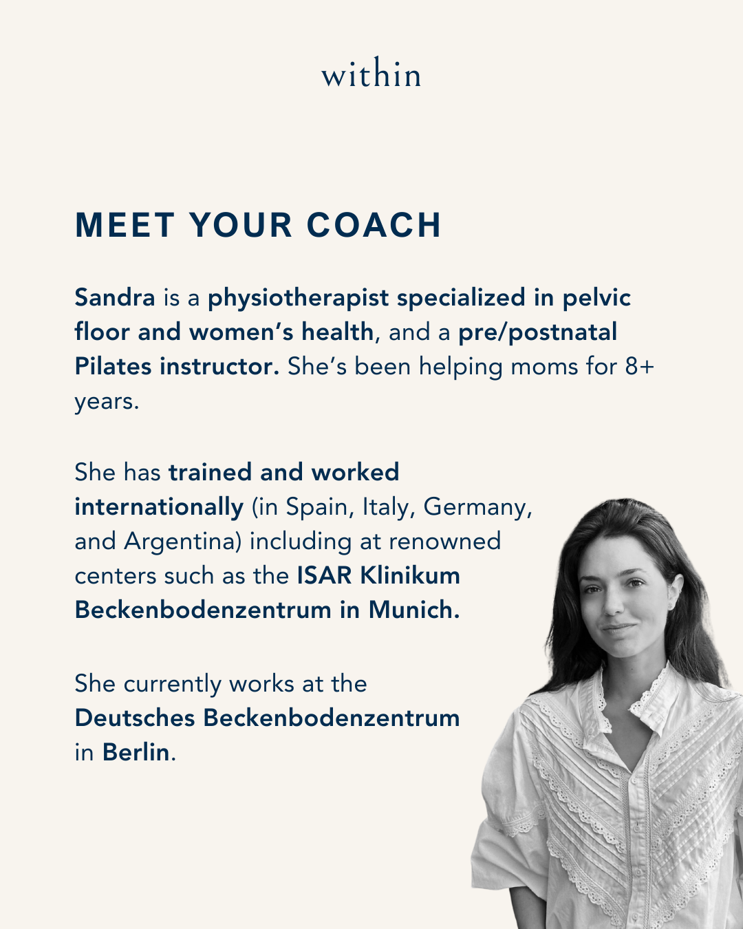 🤱 This program gives you a live step-by-step return to movement, led by a physiotherapist specialized in women’s health and pelvic floor, who's also certified in pre/postnatal Pilates and has 8+ years of clinical experience. No overwhelm. No “bouncing back.” Just a structured journey to reconnect with your body and move with strength again.